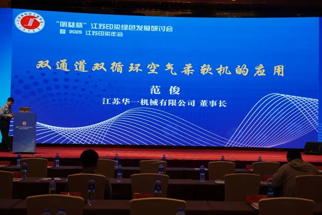 作为一场旨在通过最新科技成果与生产实战技术分享,推动江苏印染行业绿色转型的高端盛会,江苏华一机械有限公司受邀出席,董事长范俊在技术分享环节重磅展示了其引领行业的创新成果—双通道双循环空气柔软机,成为会场瞩目的焦点。