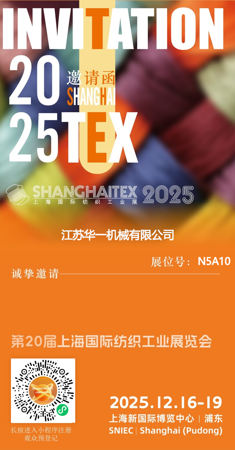 2025年岁末,亚洲纺织业盛会——第20届上海国际纺织工业展览会 即将启幕。江苏华一机械有限公司已整装待发,诚邀您莅临上海新国际博览中心 N5A10 展位,与我们零距离沟通,共话染整后处理新未来。